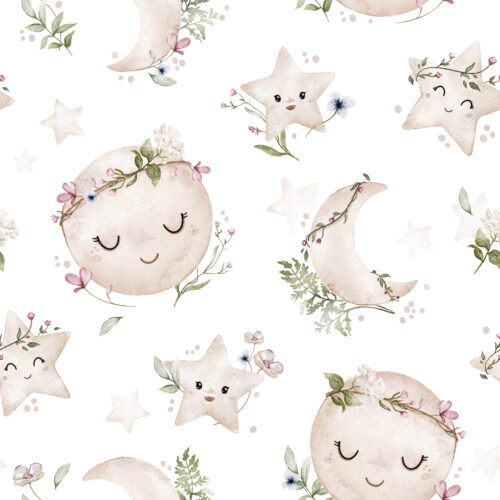 Tissu Imprimé Lune Etoiles Fleurs, 2 coloris et 11 tissus au choix