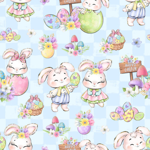 Tissu Imprimé Paques Girly Happy Easter Carreaux Bleu, 10 tissus au choix