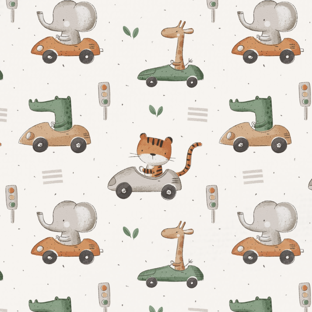 Découvrez notre magnifique imprimé Animaux Jungle Voitures Vert, idéal pour réaliser des créations pour enfants, à la fois confortables et adorables.