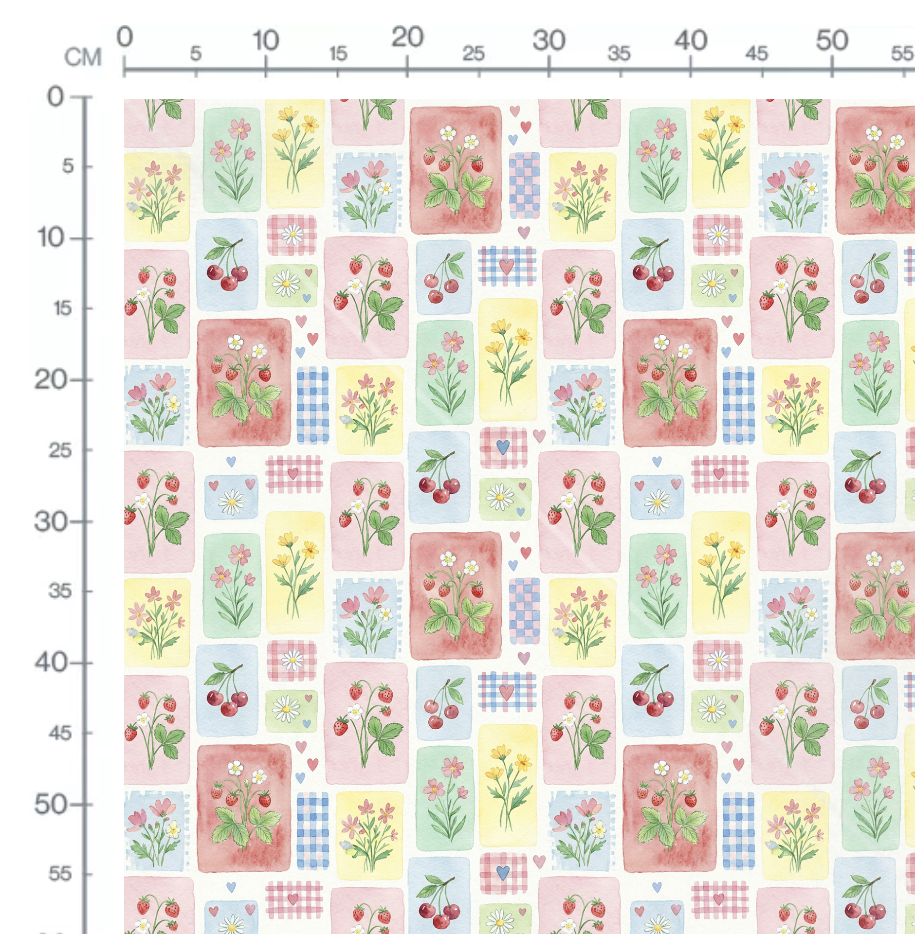 Découvrez notre magnifique tissu imprimé Beau Printemps Fraises Patchwork, idéal pour réaliser des créations pour enfants, à la fois confortables et adorables.